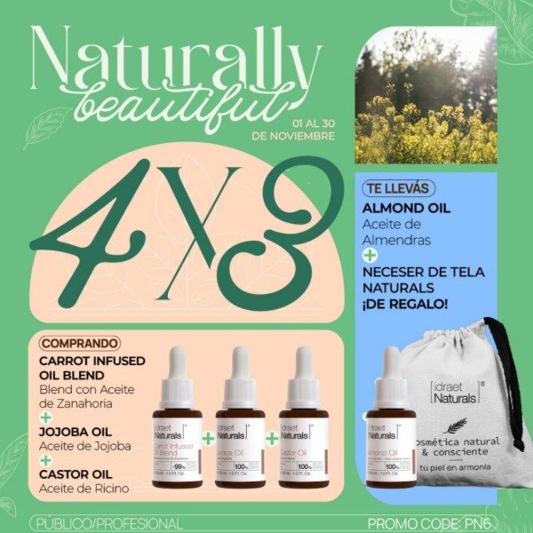 Este mes, 4x3! Comprando Carrot Oil Blend + Jojoba Oil + Castor Oil = te llevas Almond Oil + neceser DE REGALO!
